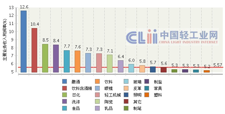 2013年1月~6月,全国轻工全行业累计主营业务收入利润率为5.57%,同比增长0.02%;日化累计主营业务收入利润率为8.45%,同比增长0.21%。日化行业本期主营业务收入利润率在轻工各行业中排名第三,行业盈利水平较高。