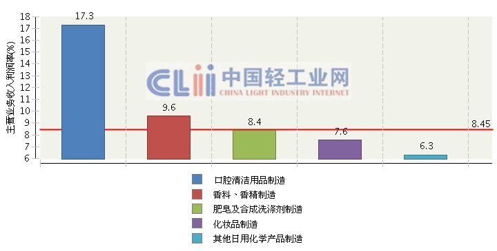 2013年1-6月,口腔清洁用品制造累计主营业务收入利润率为17.29%,同比增长1.68%;香料、香精制造累计主营业务收入利润率为9.59%,同比增长-0.7%;肥皂及合成洗涤剂制造累计主营业务收入利润率为8.37%,同比增长-0.31%;化妆品制造累计主营业务收入利润率为7.55%,同比增长1.46%。
