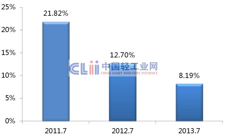 2013年1月~7月,全国日化行业规模以上企业(下同)累计完成主营业务收入同比增长8.19%,增速为三年以来同期最低。