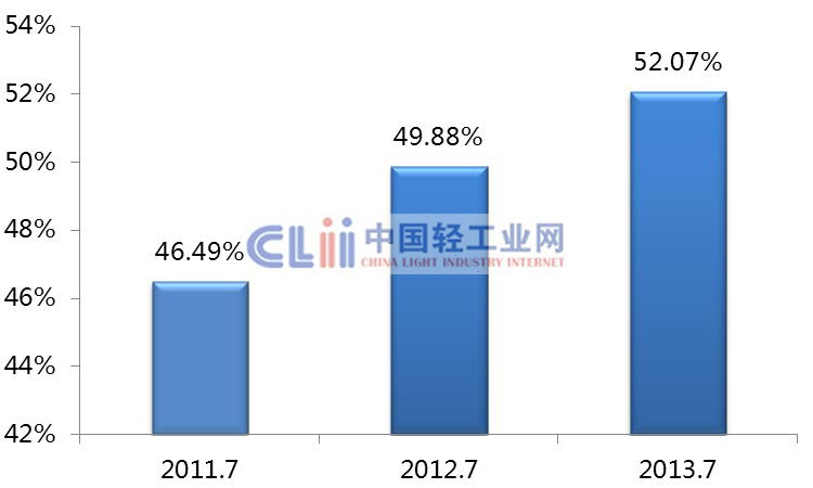 图2.4 3年1~7月全国日化行业内资企业累计主营业务收入占比情况