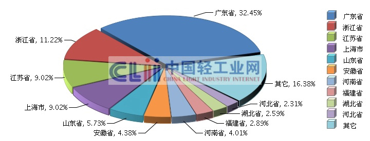 2013年1~7月全国电池行业主营业务收入较高的产区主要集中在广东省、浙江省、江苏省、上海市、山东省、安徽省、河南省、福建省、湖北省、河北省等地区,以上十个地区完成主营业务收入占全国的83.62%。