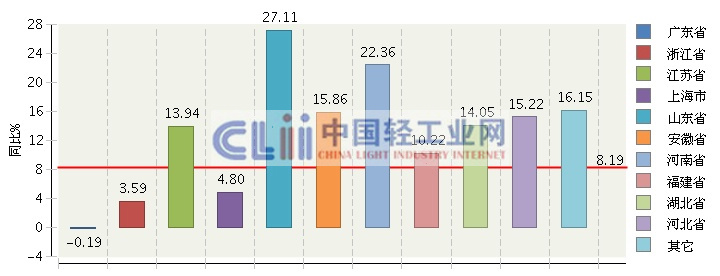 图2.10 2013年1~7月全国日化行业累计主营业务收入主要地区同比增长情况
