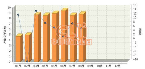 图1 2013年1~8月全国陶瓷砖行业月度产量及同比