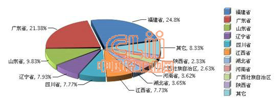 图2 2013年1~8月全国陶瓷砖累计产量地区占比情况