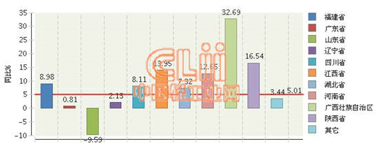 图3 2013年1~8月全国陶瓷砖累计产量主要地区同比增长情况
