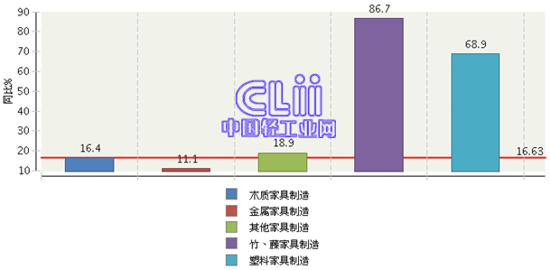 同期,木质家具制造业和金属家具制造业的累计利润总额增速(下同)分别比家具行业平均水平低了0.18个百分点和5.56个百分点,其他家具制造业超过家具行业平均水平2.27个百分点,竹、藤家具制造业和塑料家具制造业的累计增速分别超过了86%和68%(图5)。