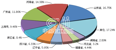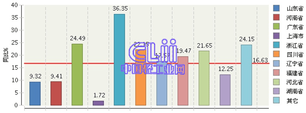 1~7月,家具行业累计利润居全国前十位地区的排名与1~6月相同,其中,山东累计利润总额(下同)占16.75%,河南占14.38%,广东占11.86%,上海占9.46%,浙江占8.40%,四川占6.33%,辽宁占5.05%,福建占4.44%,河北占3.20%,湖南占2.89%(图6)。与1~6月相比,河南、广东与河北3个地区的占比有所扩大,而其他7个地区的占比均出现收窄。