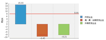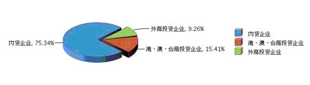 从企业注册类型看,内资企业利润总额占比大,增长较快。内资企业完成累计利润总额占75.34%,同比增长15.03%;港、澳、台商投资企业完成累计利润总额占15.41%,同比增长-9.45%;外商投资企业完成累计利润总额占9.26%,同比增长-8.21%。