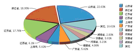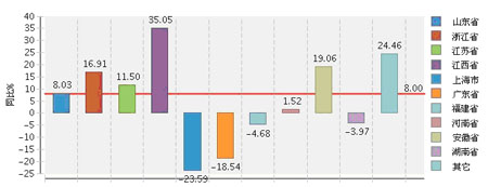 2013年1~8月全国文体行业利润较高的产区主要集中在山东、浙江、江苏地区,3个地区完成利润总额占全国的59.34%。山东省完成累计利润总额占22.63%,同比增长8.03%;浙江省完成累计利润总额占18.95%,同比增长16.91%;江苏省完成累计利润总额占17.76%,同比增长11.5%。