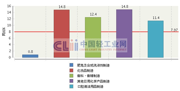 图4 2013年1~8月日化子行业规模以上企业累计主营业务收入增速情况