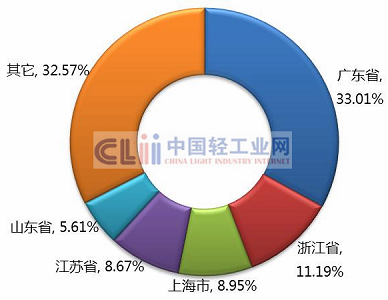 1月~8月,全国日化行业完成累计主营业务收入比重主要集中在广东省、浙江省、上海市、江苏省、山东省等地区,以上五大省市累计完成主营业务收入占全国的67.43%。(图5)。