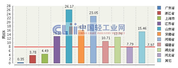 图6 2013年1~8月主要地区日化行业规模以上企业累计主营业务收入增速情况