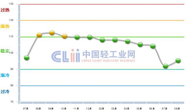 图1 2012年7月~2013年8月日化行业利润景气指数变化态势
