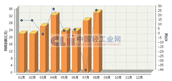 1月~8月,全国日化行业规模以上企业(下同)累计完成利润总额同比增长3.68%。其中,8月份完成利润总额同比增长28.74%,较7月份增长4.44亿美元(图2)。