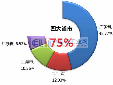 1月~8月,全国日化行业完成累计利润总额比重主要集中在广东省、浙江省、上海市、江苏省,以上四大省市合计完成利润总额占全国的74.88%(图4)。