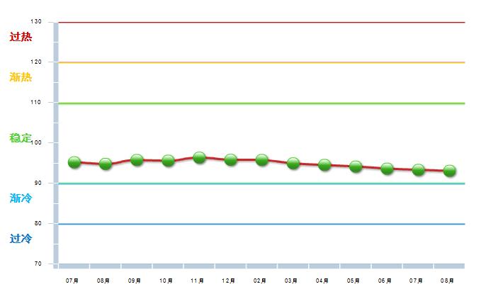 2013年8月中轻钟表景气指数为95.27,与去年同期相比下降5.2,环比下降2.19(参见图1-1)。中轻钟表景气指数仍然稳定在绿色稳定区域,但整体呈现下降趋势。(参见图1-2)