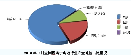 2013年9月,全国锂离子电池行业完成产量同比增长12.90%。其中,东部完成产量同比增长1.55%;西部完成产量同比增长57.73%;中部完成产量同比增长47.22%;东北部完成产量同比增长-72.32%。(数据来源:中国轻工业预测预警系统)