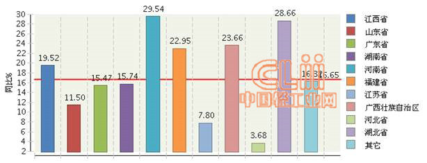 2013年1~9月在全国陶瓷主产区中,河南、湖北、广西、福建累计完成主营业务收入同比增速位居前列,同比增长均达到20%以上,详见图5。