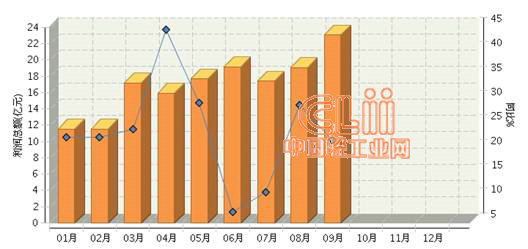 从月度情况看,6、7月份同比增速出现大幅回落,6月份同比增长仅为7.16%,为年内单月最低增速;8、9月份增速回升至20%以上,其中9月份完成利润总额23.07亿元,为年内单月最高值。详见图1。