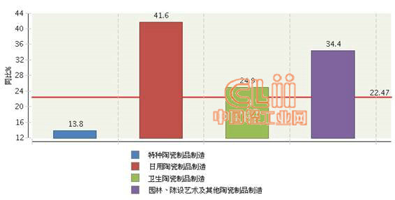 在所有子行业中,特种陶瓷子行业累计完成利润总额居首位,累计利润总额82.24亿元(同比增长13.81%),占53.92%。日用陶瓷累计完成利润总额同比增长41.64%,增速居各子行业首位。详见图2、3。