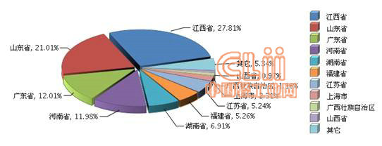 2013年1~9月陶瓷行业完成利润总额前四位的地区依次是江西、山东、广东、河南,其中江西累计完成利润总额同比增长18.32%,占27.81%;山东累计同比增长8.13%,占21.01%。详见图4。