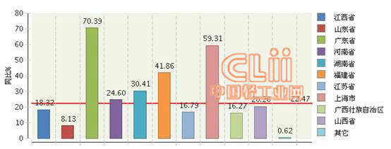 2013年1~9月,在全国主要陶瓷产区中,广东、上海、福建、湖南、河南等地区累计完成利润总额同比增速位居前列,超过全国平均增速,详见图5。