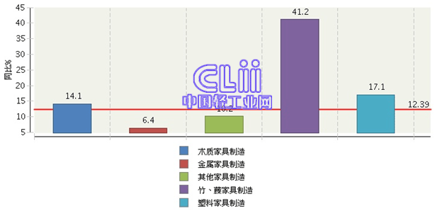 图5 2013年1~8月家具子行业规模以上企业累计主营业务收入增速情况
