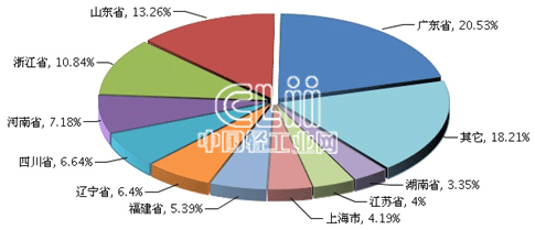 图6 2013年1~8月主要地区家具行业规模以上企业累计主营业务收入占比情况