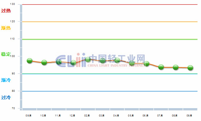 2013年1-9月,日化行业规上企业主营业务收入景气指数大致呈逐渐下滑态势,由年初2月的98.13点降至9月的93.38点,下降4.75点,反映行业主营收入增速放缓,略显疲态。