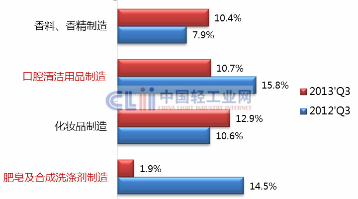 2013年1月~9月,各日化子行业中,口腔清洁用品制造累计主营业务收入利润率最高,为17.48%,其次是香料、香精制造、肥皂及合成洗涤剂制造和化妆品制造。