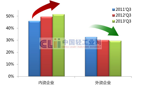 近年内外资企业在日化行业竞争激烈,从近三年前三季度累计主营业务收入占比对比情况看,内资企业占比逐年扩大,而外资企业成占比缩小态势,到2013年三季度,内资企业累计完成利润总额占比已较2011年同期上涨5.69个百分点,而外资企业占比则下降3.18个百分点。