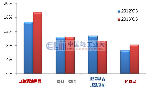 2013年1月~9月,肥皂及合成洗涤剂制造完成累计主营业务收入同比增长1.85%;化妆品制造完成累计主营业务收入同比增长12.85%;香料、香精制造完成累计主营业务收入同比增长10.42%;其他日用化学产品制造完成累计主营业务收入同比增长14.93%;口腔清洁用品制造完成累计主营业务收入同比增长10.65%。