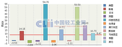 从向各贸易国出口的增速看,对印度尼西亚和马来西亚的出口实现高速增长,分别达到54.76%和50.50%;而对日本、英国、新加坡和美国的出口均较去年同期出现不同程度的下降。