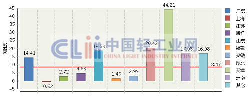 虽然以上四省市出口额占绝对优势,但是除广东实现14.41%的增长外,其他三省均增长乏力,上海日化出口出现了0.62%的负增长,江苏、浙江两地也仅实现了2.72%和4.68%的低速增长。出口增长较快的地区包括天津(同比增长44.21%)、湖北(同比增长20.42%)和山东(同比增长18.59%)。