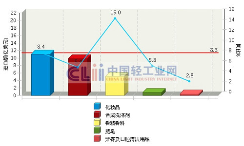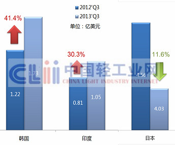 从增速上看,从韩国、印度进口增长迅猛,同比增长分别达到41.4%和30.3%;自日本进口因为“钓鱼岛事件”影响,日化进口额下降11.6%。
