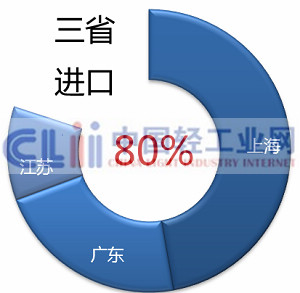 从各省市进口增速看,上海、江苏和广东三个进口大省增速较低,均低于全国平均增长速度;安徽和北京两地实现进口额大幅增长,同比增速分别达到60.2%和30.73%;另外浙江和天津两地进口额有小幅下降。