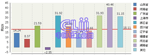1~9月,家具行业累计利润居全国前十位地区的排名依然不变,依次是山东累计实现利润总额(下同)40.47亿元,占16.75%;河南累计实现34.40亿元,占14.24%;广东累计实现31.04亿元,占12.85%;上海累计实现21.33亿元,占8.83%,浙江累计实现18.19亿元,占7.53%;四川累计实现13.63亿元,占5.64%;辽宁累计实现11.64亿元,占4.82%;福建累计实现10.33亿元,占4.28%;河北累计实现8.92亿元,占3.69%;湖南累计实现7.11亿元,占2.94%(图6)。与1~8月相比,山东、河南、广东和湖南4个地区的占比都有不同程度的扩大。