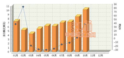 据海关数据显示,2013年1~10月,全国陶瓷制品累计出口近68亿美元,同比增长1.47%。其中10月当月出口超10亿美元,同比增长43.38%,出现大幅反弹。
