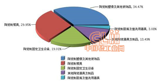 图2 2013年1~10月全国陶瓷制品累计出口额商品小类占比情况