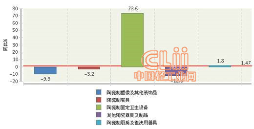 图3 2013年1~10月全国陶瓷制品累计出口额商品小类同比增长情况