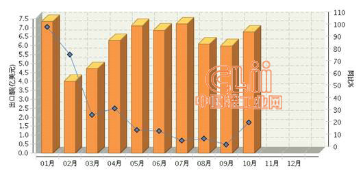 从月度出口额情况看,自5月起,月度出口增速出现下滑态势,至9月份,月度出口增速跌落至7.09%,为年内单月最低增速。10月份,出口同比呈现上扬,增速回升至增速25.2%。详见下图。