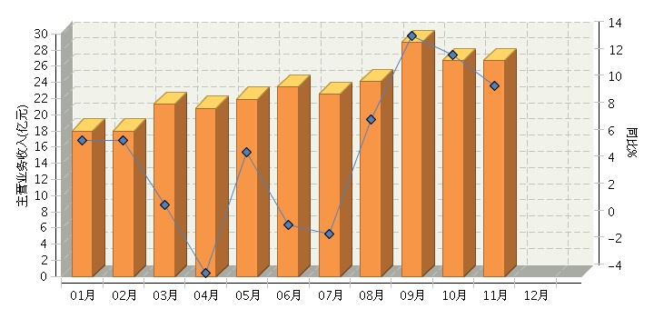 2013年1~11月,全国乐器制造行业累计主营业务收入同比增长5.44%。其中:4月份、6月份、7月份出现负增长,分别同比下降3.71%、0.2%、0.82%。从月度额看,9月份达到今年最高值,主营业务收入28.93亿元,同比增长13.86%;10月份完成主营业务收入26.7亿元,同比增长12.44%;11月份完成主营业务收入26.69亿元,同比增长10.15%。