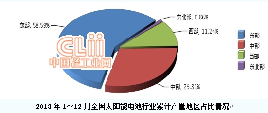2013年1~12月全国太阳能电池行业累计产量地区分布情况