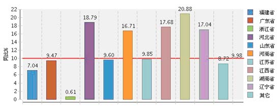 2013年1~11月全国皮革行业主营业务收入同比增长较快的地区是湖南、河北、江西、辽宁、河南地区,分别为20.88%、18.79%、17.68%、17.04%、16.71%。