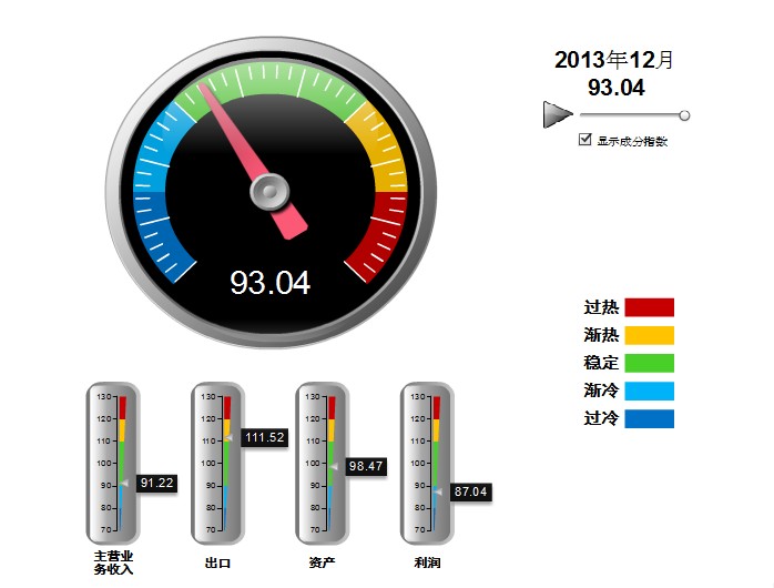 2013年12月份中轻饮料景气指数为93.04。具体的分项指数为:主营收入景气指数91.22、出口景气指数111.52、资产景气指数98.47、利润景气指数87.04。