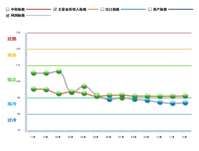 2013年饮料行业利润景气指数运行在绿色稳定区间,由图可以看出,前3个月经过小幅震荡后,6月份开始景气指数呈缓慢下降走势,进入渐冷区域。