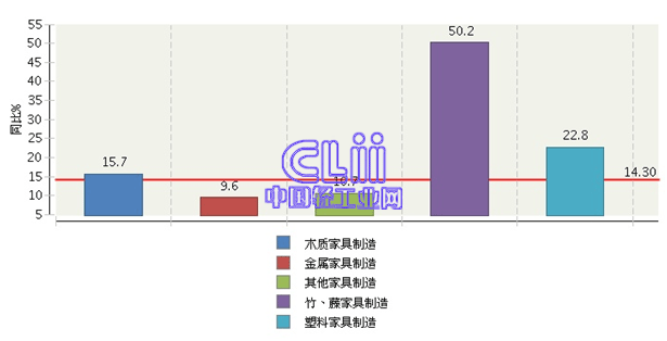 竹、藤家具制造业的累计主营业务收入增速(下称“累计增速”)遥遥领先,攀升到50.23%;塑料家具制造业的累计增速次之,达到了22.78%;木质家具制造业的累计增速为15.69%;金属家具制造业和其他家具制造业的累计增速均低于全行业平均水平(图5)。