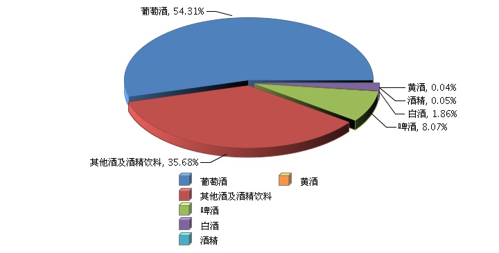 2013年,酿酒行业完成进口额同比降低3.5%,其中葡萄酒同比降低1.5%,其他酒及酒精饮料同比降低13.8%,啤酒完成同比增长60.6%。在酿酒行业进口总额中,葡萄酒占54.31%,其他酒及酒精饮料占35.68%,啤酒占8.07%。
