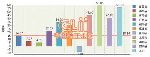 图2 2014年1~2月全国陶瓷行业累计利润总额主要地区同比增长情况