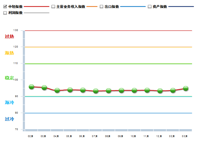 和中国皮革工业协会联合发布2014年3月中轻皮革景气指数。3月份中轻皮革景气指数94.82,较2月的93.65略升1.17个百分点。其中:主营业务收入景气指数为93.33,出口景气指数为103.72,资产景气指数为96.29,利润景气指数为93.86(参见图1、2)。
